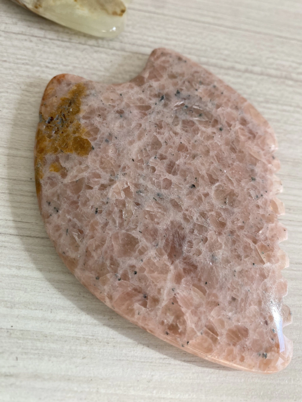 Este formato de guasha es muy versatil y sirve tanto para rostro como para cuerpo. La arista dentada permite trabajar arrugas especificas haciendo el efecto "goma de borrar" despegando adherencias y su curva permite trabajar en la definicion del ovalo facial y de pomulos con mucha presicion. Su terminacion en punta sirve para trabajar puntos de acupuntura y areas pequeñas del rostro, como parpados o contorno de labios. Es un modelo ideal si queres trabajar arrugas localizadas, y sobre la definicion de las facciones de tu rostro. Medida: 5,5 cm x 8,5 cm.