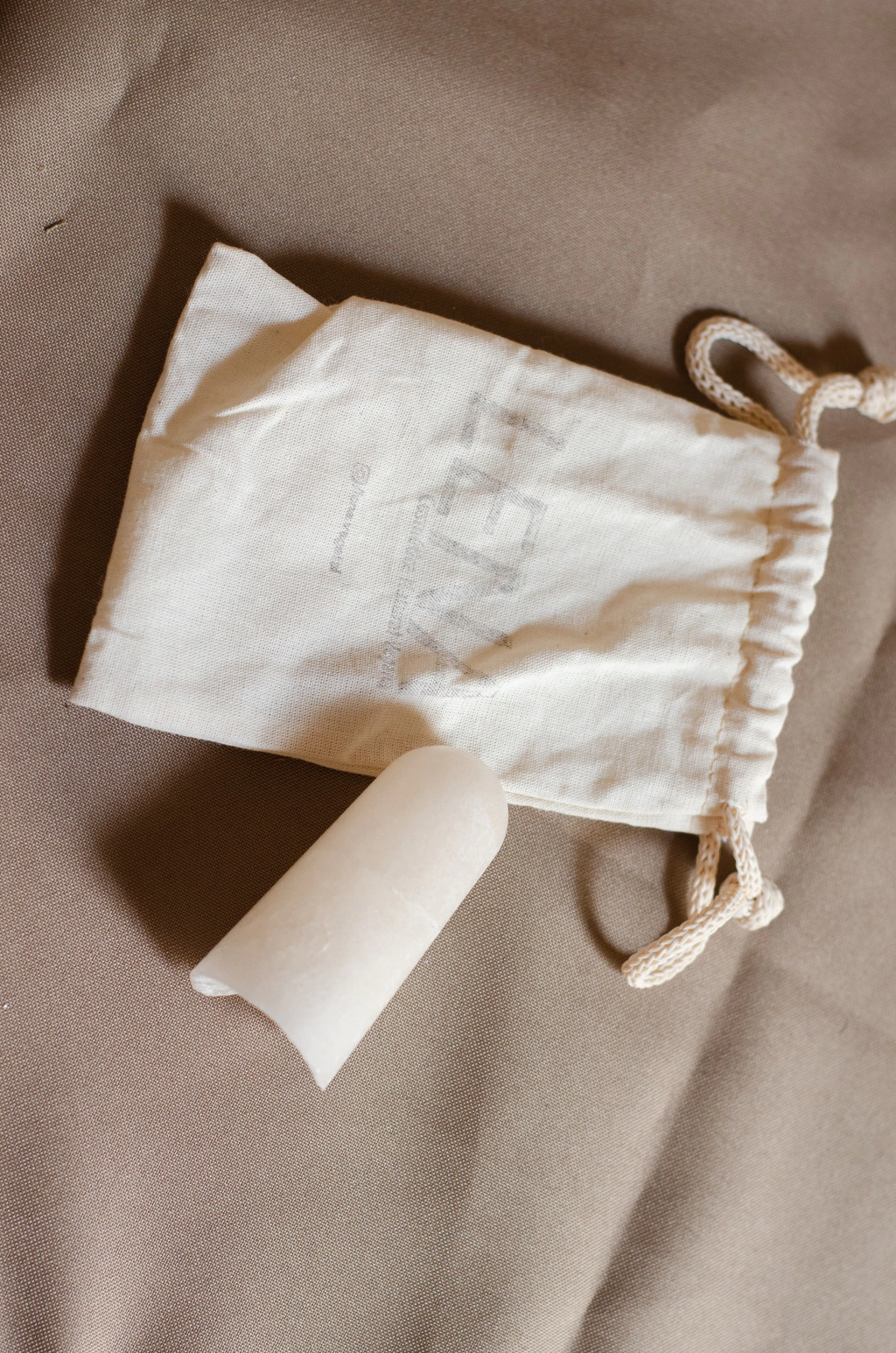 Piedra de alumbre natural completamente pulida + bolsita de lienzo para guardarla correctamente.